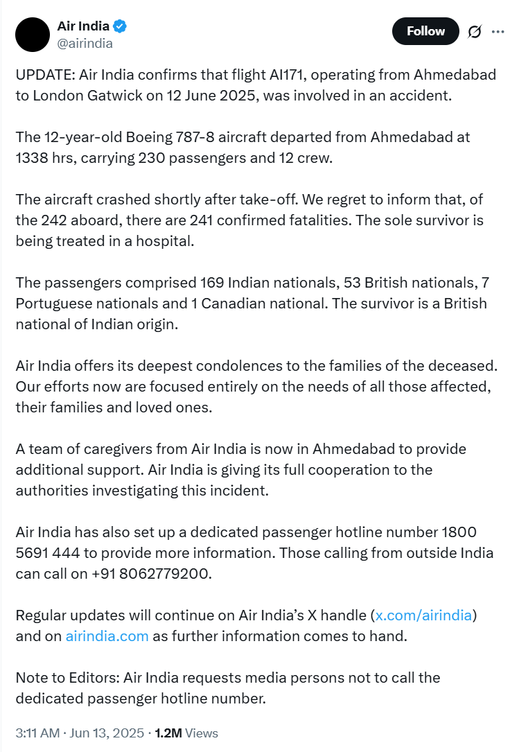 6月13日,印度航空公司通过社交平台X确认,机上共有242人,已有241人确认遇难,仅1人生还。唯一幸存者为一名印裔英国籍乘客,胸部受伤,目前正在医院接受治疗。
