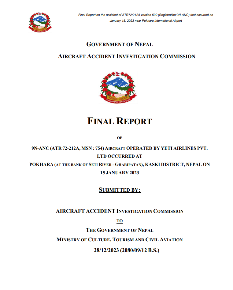 2023年12月28日,尼泊尔政府航空器事故调查委员会发布关于雪人航空公司YT691航班坠机事故的最终调查报告截图。