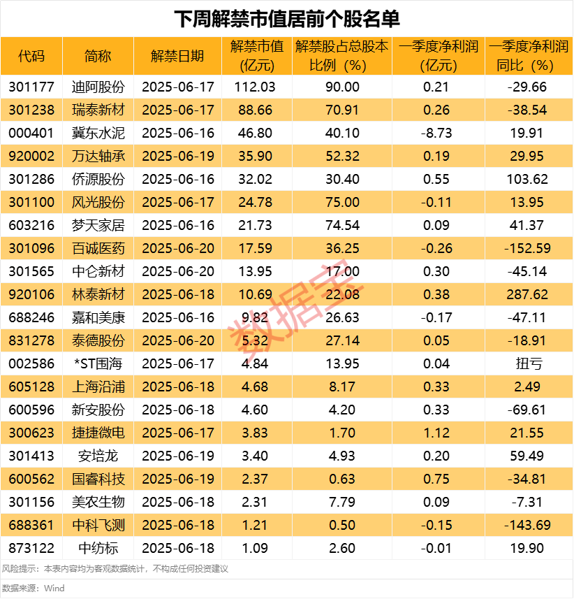 一般而言,解禁的利空影响对于净利润亏损或下滑的个股要显著大于绩优股。下周面临解禁的个股中有12股一季度归母净利润亏损,冀东水泥的亏损规模最大,一季度归母净利润亏损8.73亿元,公司本次解除限售股份的数量为10.66亿股,占公司发行总股本的40.1%。本次解除限售的股份上市流通日期为2025年6月16日,解禁股类型为定向增发机构配售股份。