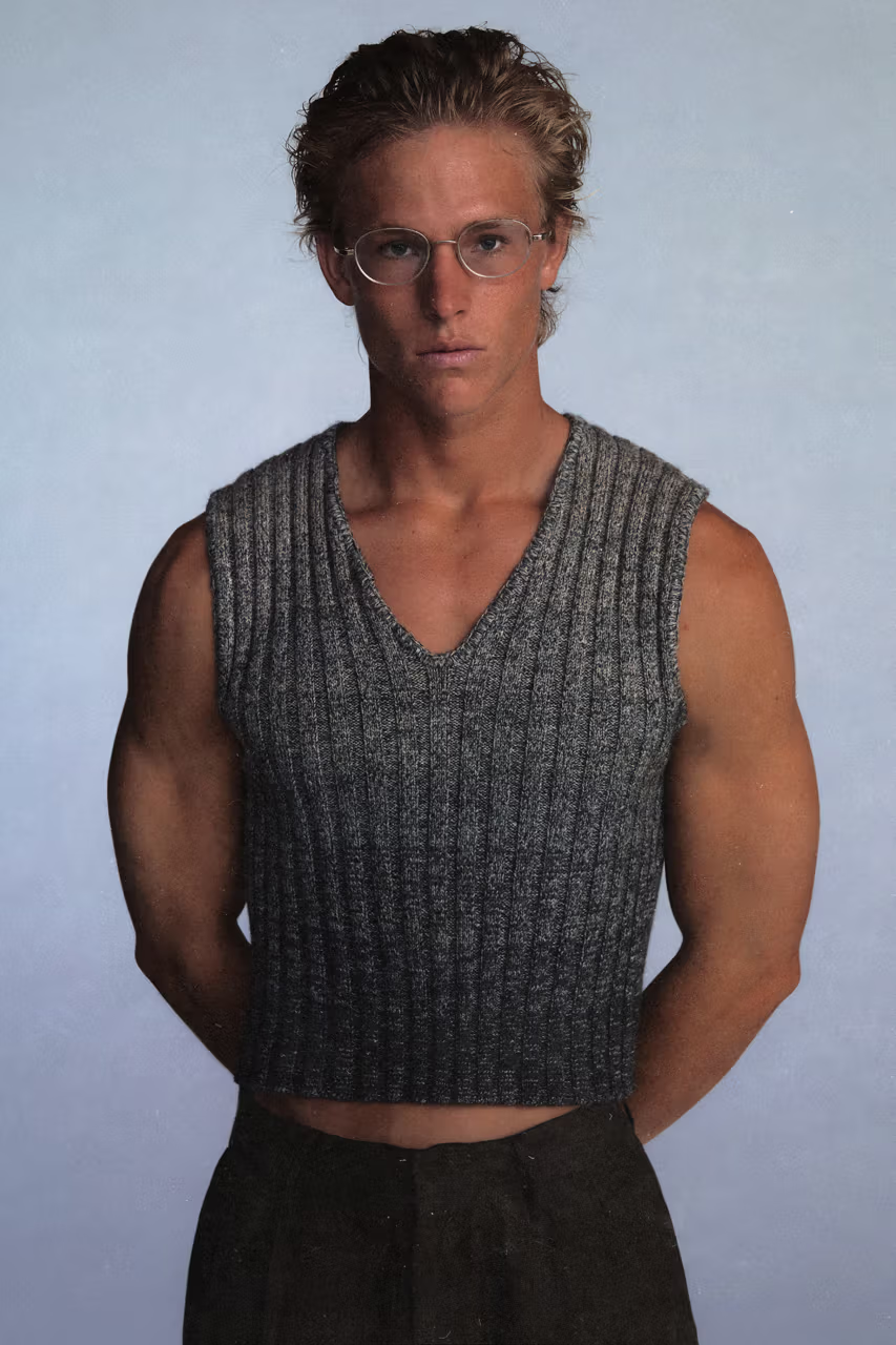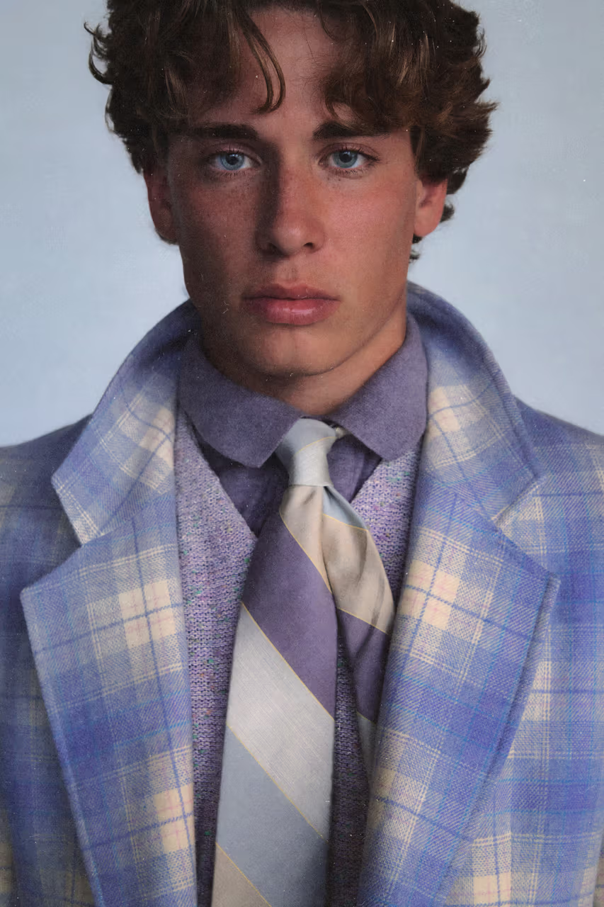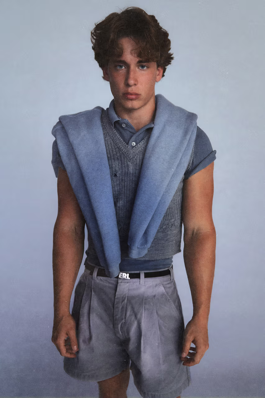 系列主打复古质感,包含褪色亚麻西装、V 领针织衫、褶皱短裤等单品,辅以水洗、拉毛与做旧处理。此外,标志性的超短泳裤、冲浪尼龙材质也回归,呼应品牌加州血统。细节上点缀波点领带、巴洛克印花与条纹衬衫,打造略带戏剧张力的“破坏版常春藤”。这一季,ERL 继续以叙事美学与美式文化混剪方式,将校园制服风格演绎得更怪诞也更个人化。