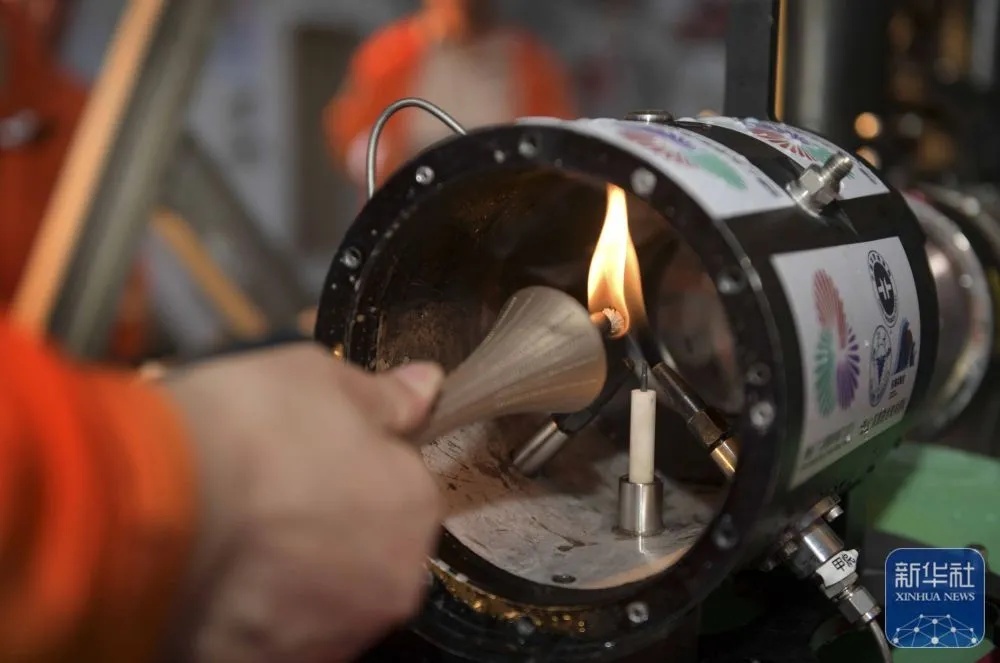 ↑9月18日,在科考船甲板面,工作人员从搭载在“海马”号深海遥控潜水器上的采火装置里取火。新华社记者 卢汉欣 摄