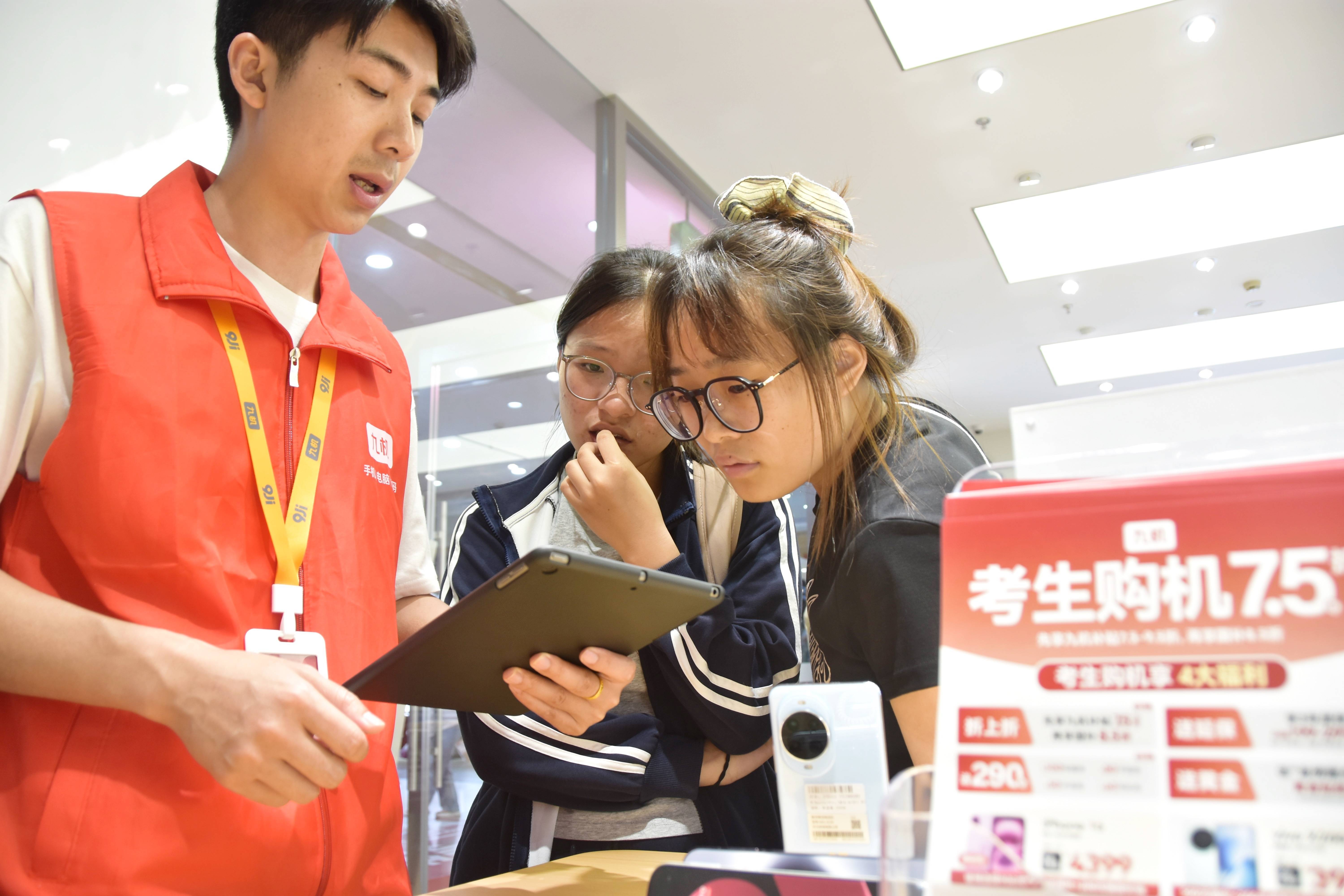 6月23日,云南省蒙自市一商店工作人员为两名今年的高考考生讲解手机以旧换新政策。新华社发(薛莹莹摄)在吉林,不少滑雪场夏季开门迎客