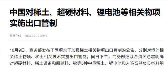华声在线2025-10-12中国对稀土、超硬材料、锂电池等相关物项实施出口管制