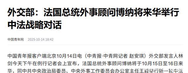 中国青年网2025-10-14外交部:法国总统外事顾问博纳将来华举行中法战略对话