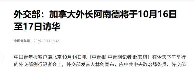 中国青年网2025-10-14外交部:加拿大外长阿南德将于10月16日至17日访华