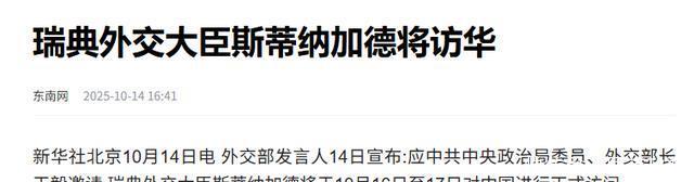 东南网2025-10-14瑞典外交大臣斯蒂纳加德将访华
