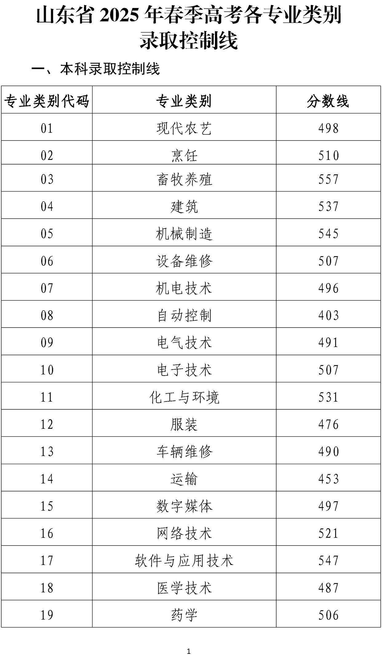 山东省2025年春季高考各专业类别录取控制线如下。