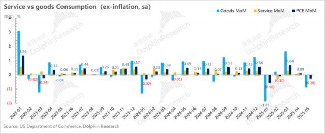 从月环比趋势来看,关税政策影响明显非常大,4 月 2 日解放日前,因为提前囤货,3 月份居民消费支出环增爆棚,接着 4 月份基本就停滞了,5 月份更是环比负增长近 0.3%。
