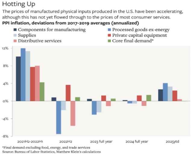那么,接下来要思考的问题很重要,关税是否真会影响到物价,并持续产生影响吗?从目前数据来看,PPI 一些核心项目已有上窜的趋势,只是目前还没有走到消费者物价当中。